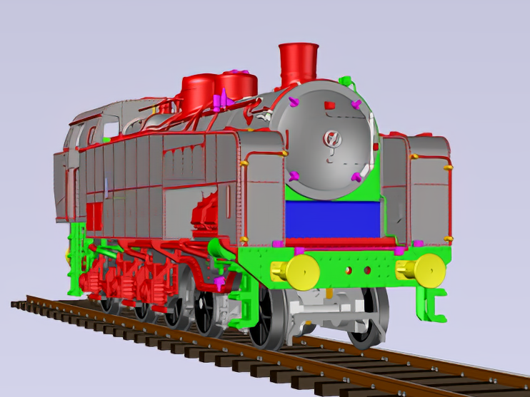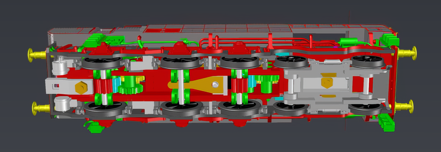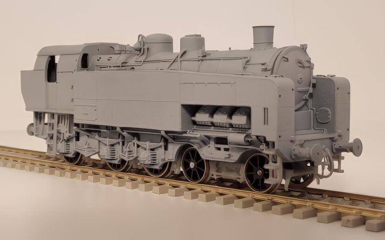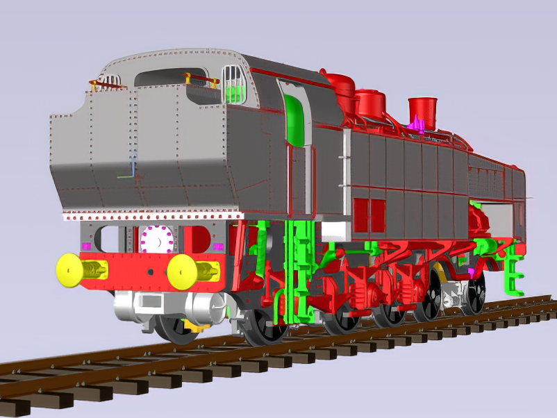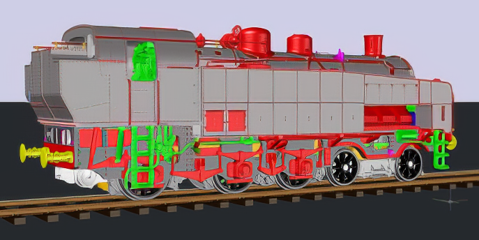 Machine assez mystérieuse et pour cause, très peu de documents, seulement 4 photos, toutes prises du coté droit de la machine, et un diagramme complètement faux. Pas facile pour en faire un modèle réduit. Heureusement, certains logiciels modernes permettent de redresser les photos en perspective. Le dessin fut facile pour le coté droit de la machine. Mais pour le coté gauche, il a fallu interpréter quelques tuyauteries et un compresseur de frein. Pareil pour l'intérieur de la cabine et le buffet. La machine comme toutes les locomotives EST Modèles a été entièrement conçue et dessinée en 3D. Ce qui permet de pouvoir comparer les dessins aux photos pour juger le respect de la silhouette du modèle réduit par rapport à la machine réelle.