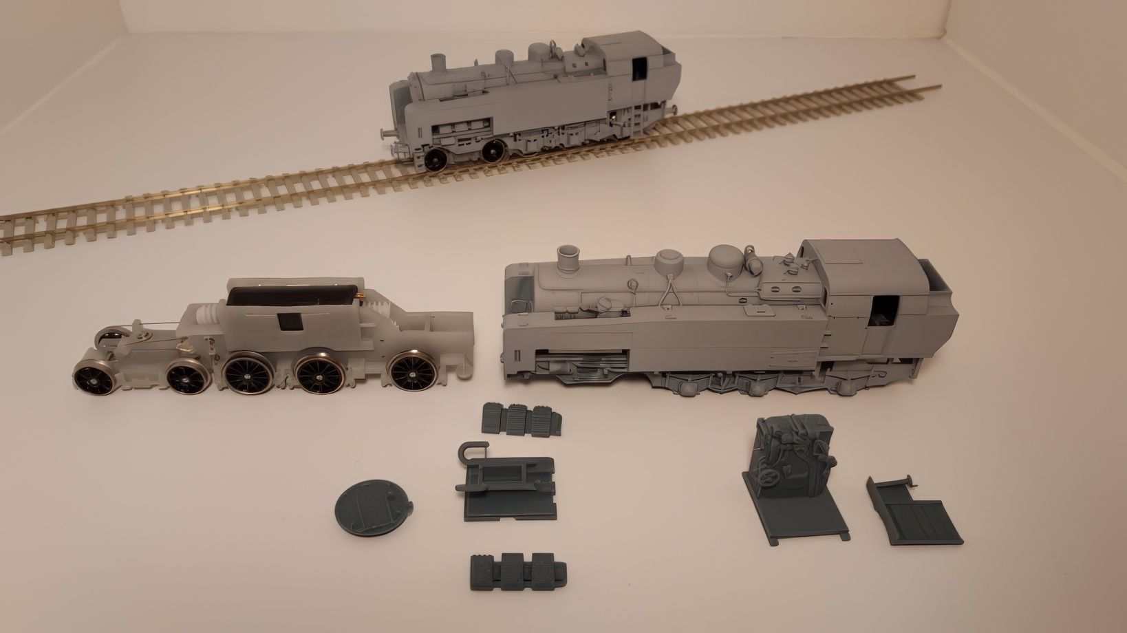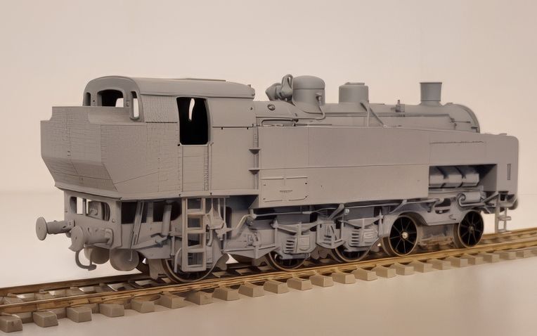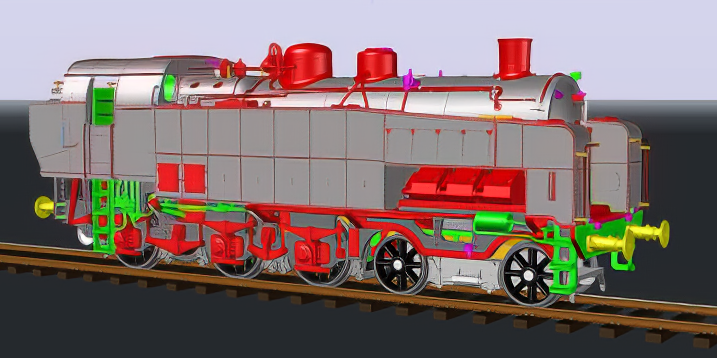 Machine assez mystérieuse et pour cause, très peu de documents, seulement 4 photos, toutes prises du coté droit de la machine, et un diagramme complètement faux. Pas facile pour en faire un modèle réduit. Heureusement, certains logiciels modernes permettent de redresser les photos en perspective. Le dessin fut facile pour le coté droit de la machine. Mais pour le coté gauche, il a fallu interpréter quelques tuyauteries et un compresseur de frein. Pareil pour l'intérieur de la cabine et le buffet. La machine comme toutes les locomotives EST Modèles a été entièrement conçue et dessinée en 3D. Ce qui permet de pouvoir comparer les dessins aux photos pour juger le respect de la silhouette du modèle réduit par rapport à la machine réelle.